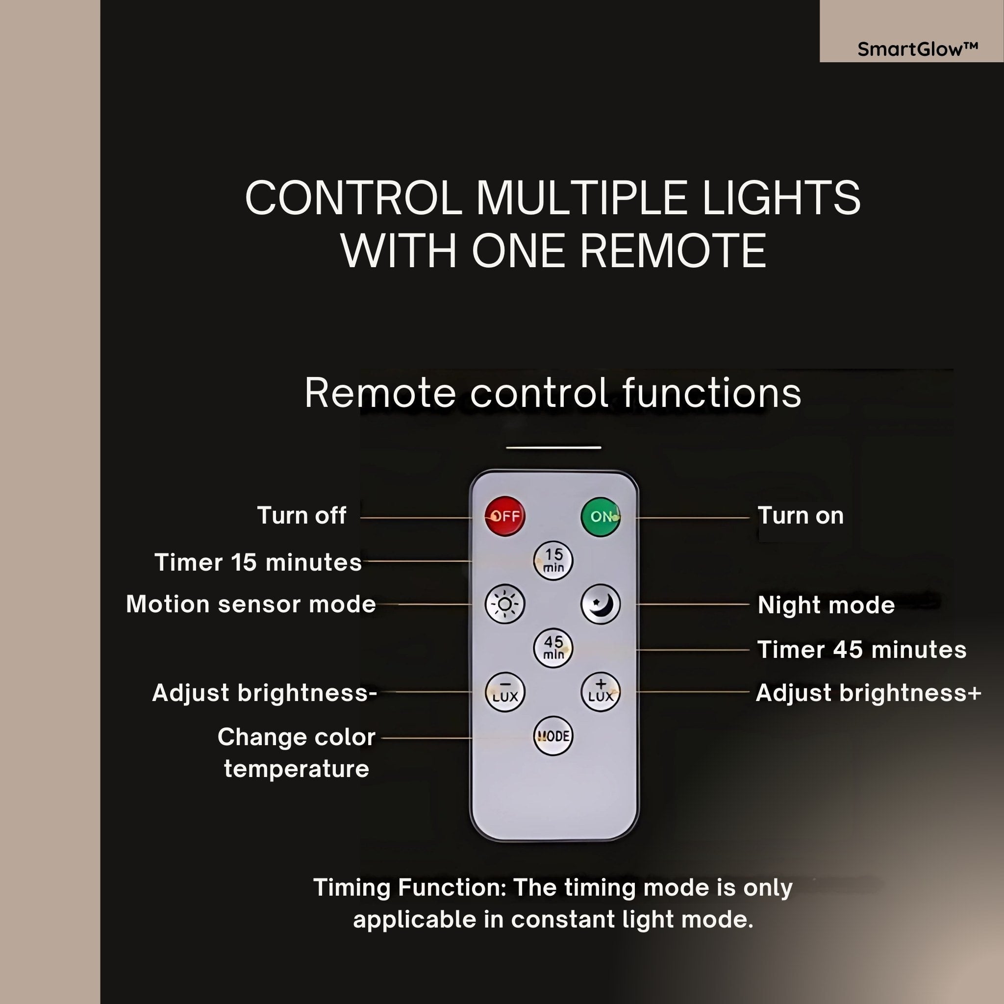 Choose between motion sensor, night mode, or always-on mode. SmartGlow adapts to your needs automatically, providing light exactly when needed.